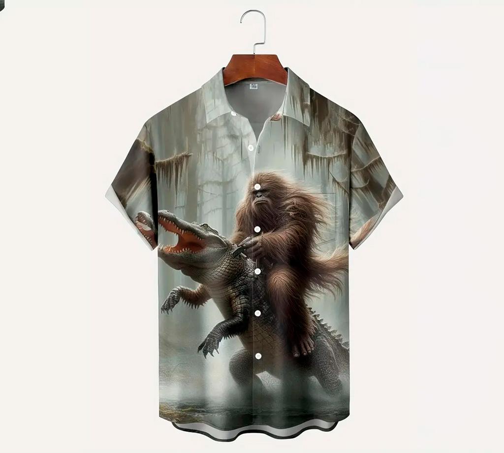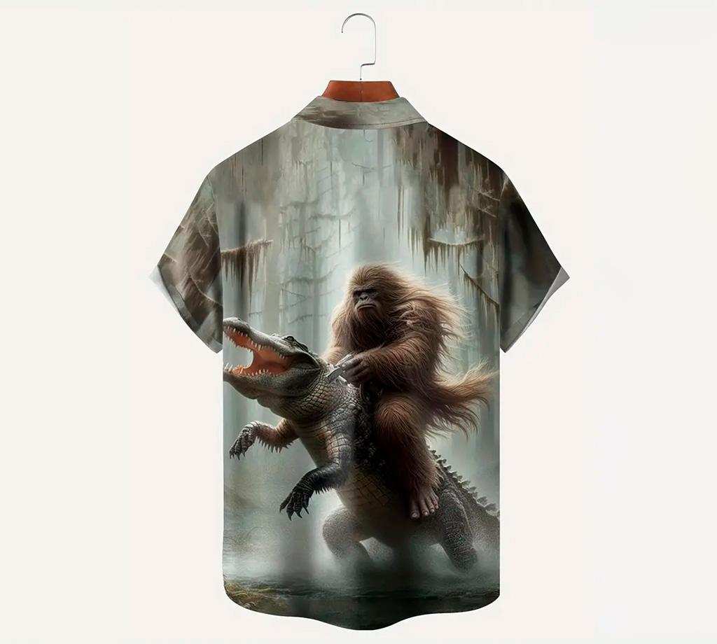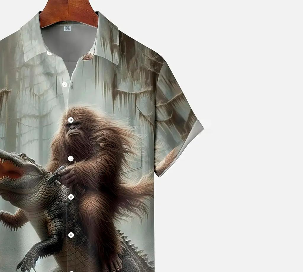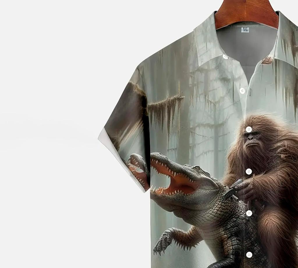 Men's Vintage Gorilla vs. Crocodile 3D Digital Print Button-Up Shirt